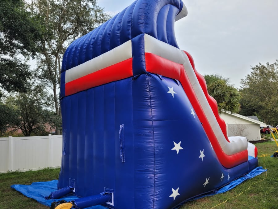 Whether you're hosting a church event, festival, daycare gathering, or birthday party, our 19ft tall Double lane Red, white and Blue Water Slide is the perfect addition to your festivities. It provides hours of entertainment and keeps everyone cool on those hot summer days.