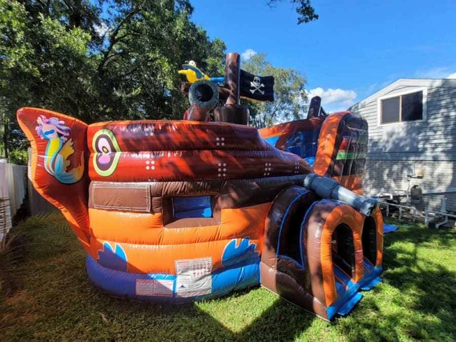 At our bounce house rental service, we prioritize the safety and well-being of your children. Our Pirate Ship Bounce House and Slide Combo is insured and regularly sanitized, ensuring a clean and hygienic environment for play. You can have peace of mind knowing that your little ones are playing in a safe and secure inflatable.