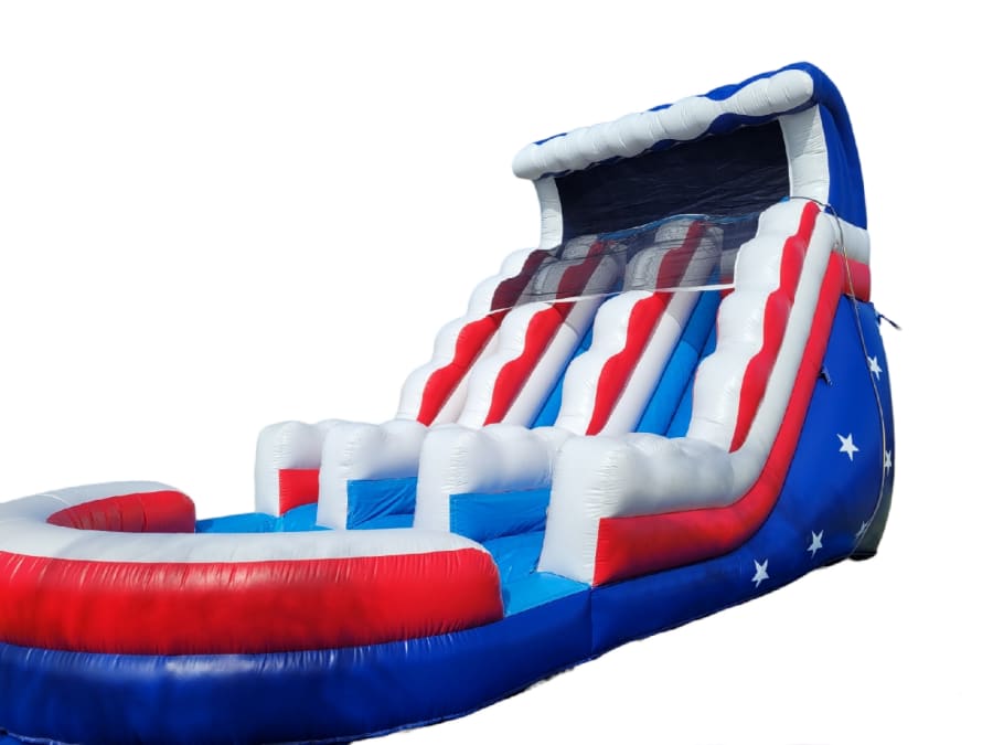 Whether you're hosting a church event, festival, daycare gathering, or birthday party, our 19ft tall Double lane Red, white and Blue Water Slide is the perfect addition to your festivities. It provides hours of entertainment and keeps everyone cool on those hot summer days.